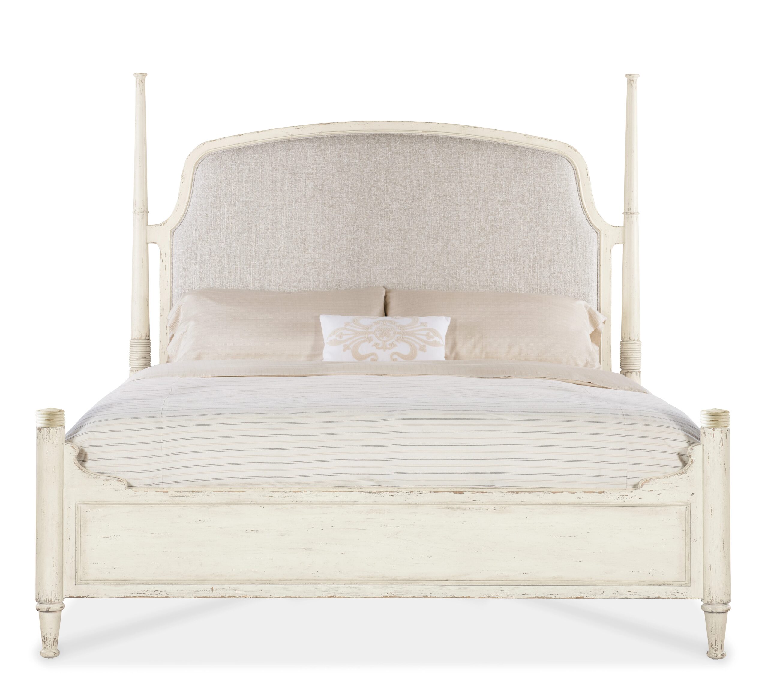 In a stunning reimagination of the classic Southern 4-poster bed, the inviting Americana King Upholstered Bed has an upholstered fabric headboard with welt trim, in a creamy white color complementing the timeworn white Daisy finish over Cathedral Oak Veneers. There are carved accents on the posts and scroll work on the upper sides of the footboard. The footboard comes with capes for a low-post option.