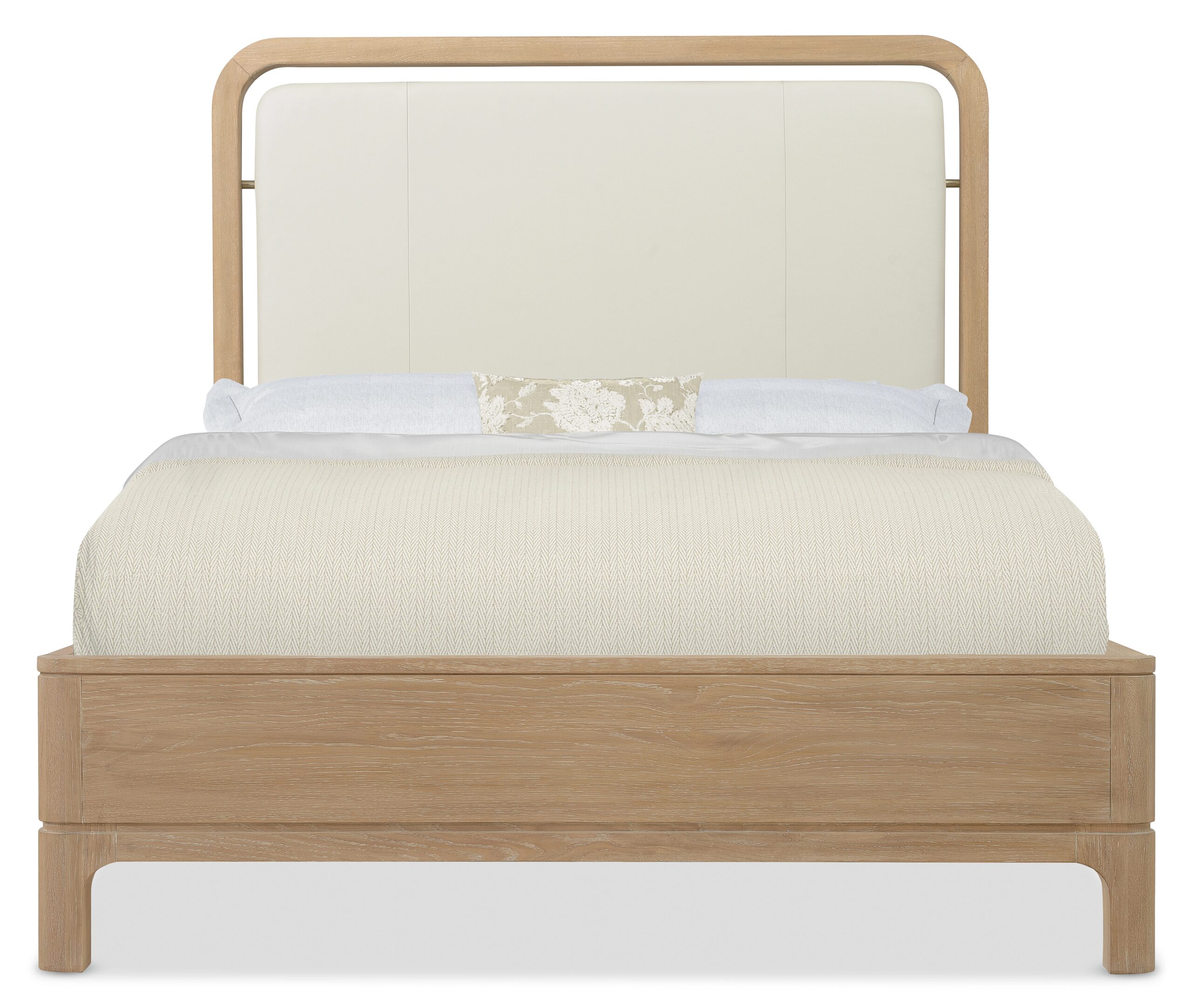 Queen panel bed in light Desert Oak over white oak solids and veneers with a finished leather-upholstered headboard. Open-frame headboard with metal supports delivers a clean, contemporary look.