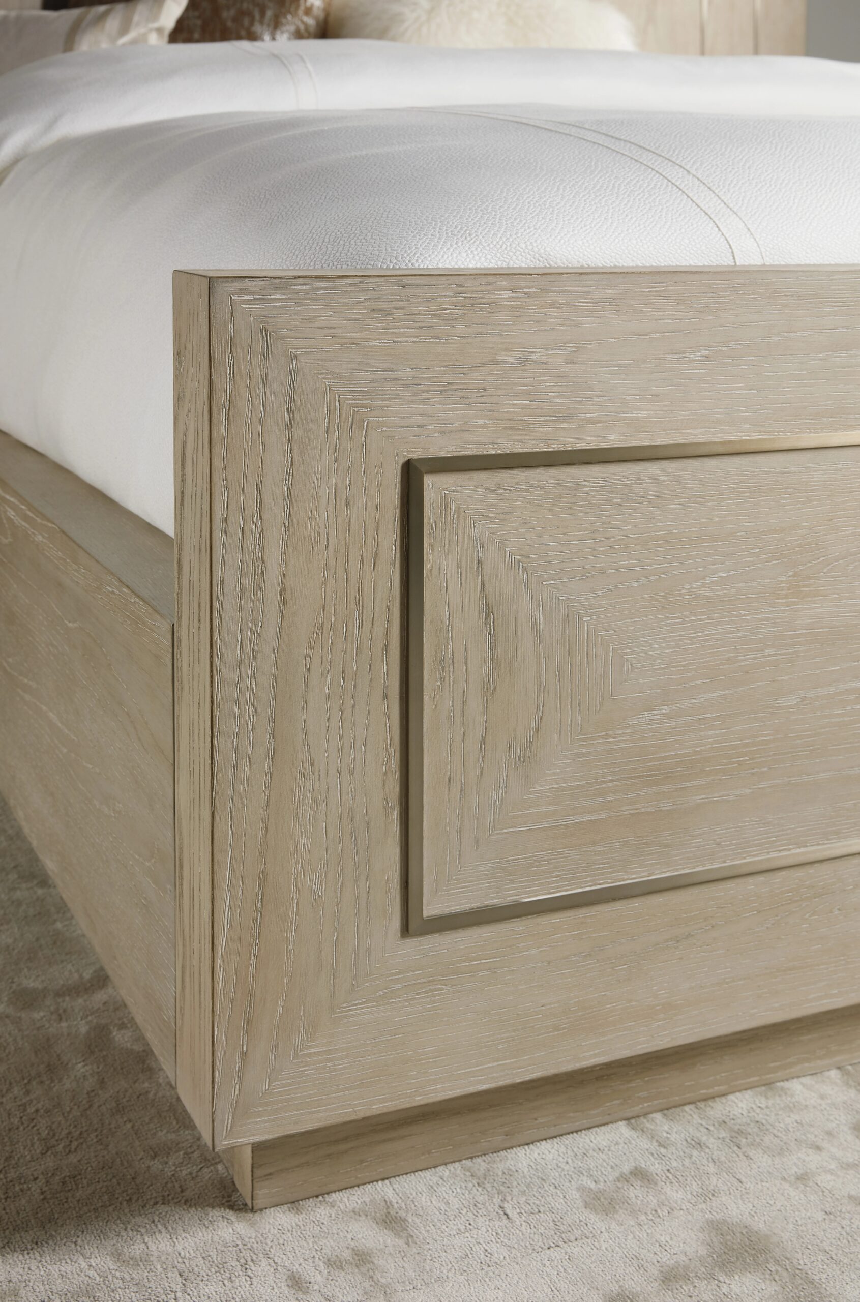 King panel bed in soft taupe oak veneers with subtle dry brushing, accented by champagne-colored metal inlays. Includes headboard, footboard, and rails.