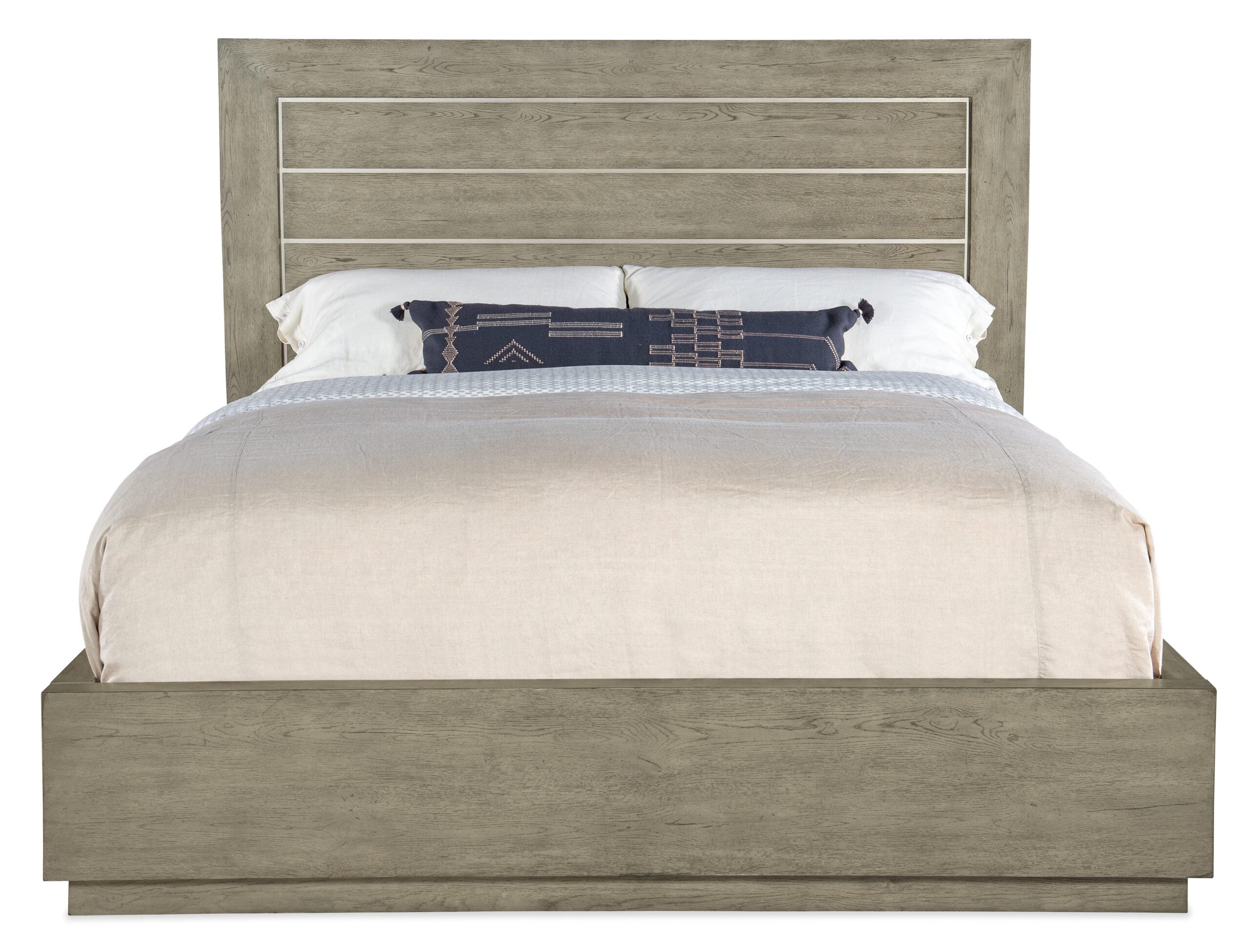 California King panel bed in oak veneers with antique pewter metal headboard accents and a soft smoked gray Mink finish. Includes headboard, footboard, and rails; headboard may be used alone.