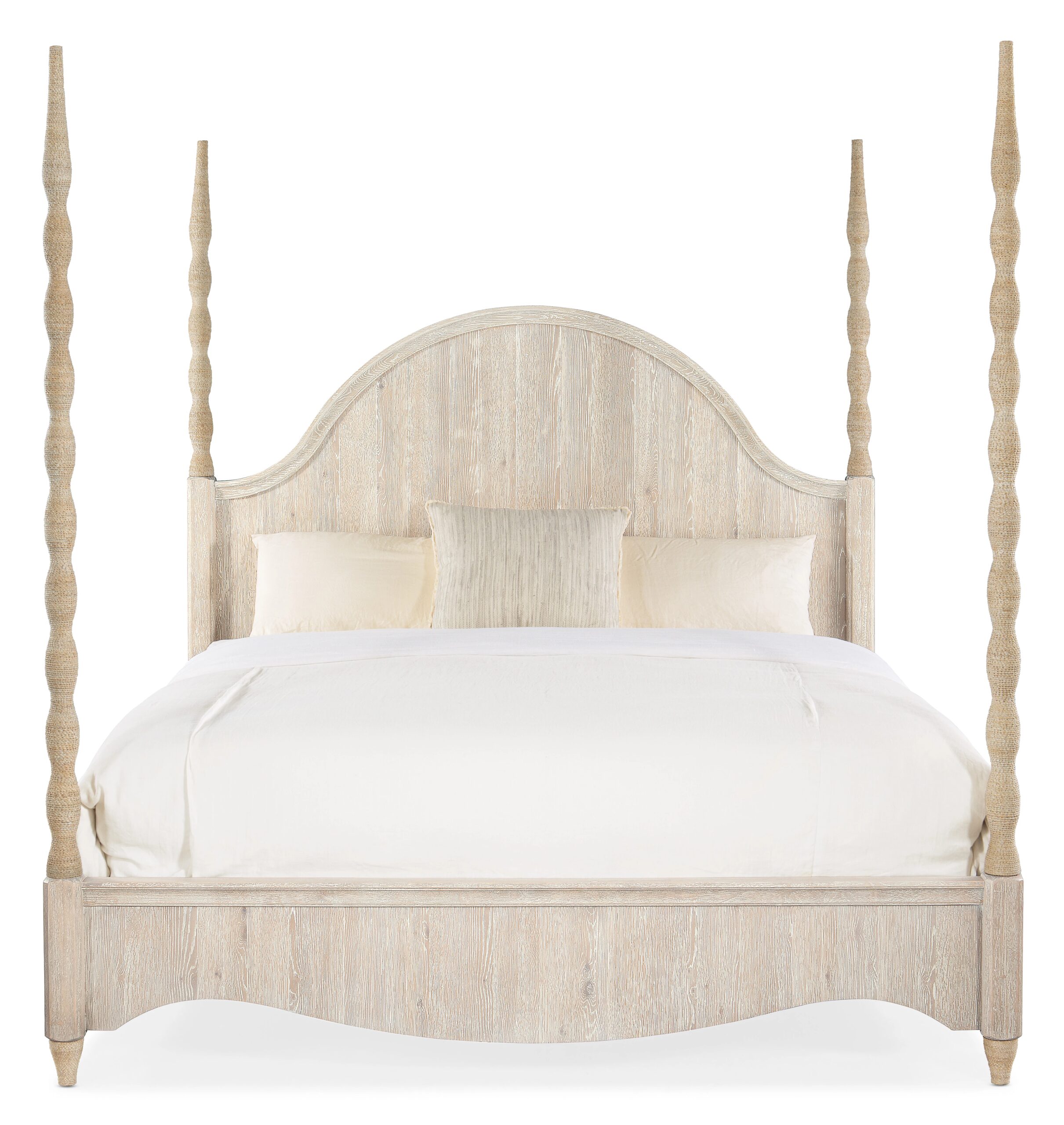 California King poster bed in whitewashed, wire-brushed Surf finish over oak veneers with rope-wrapped posts. Includes headboard, footboard and rails; headboard can be used alone.