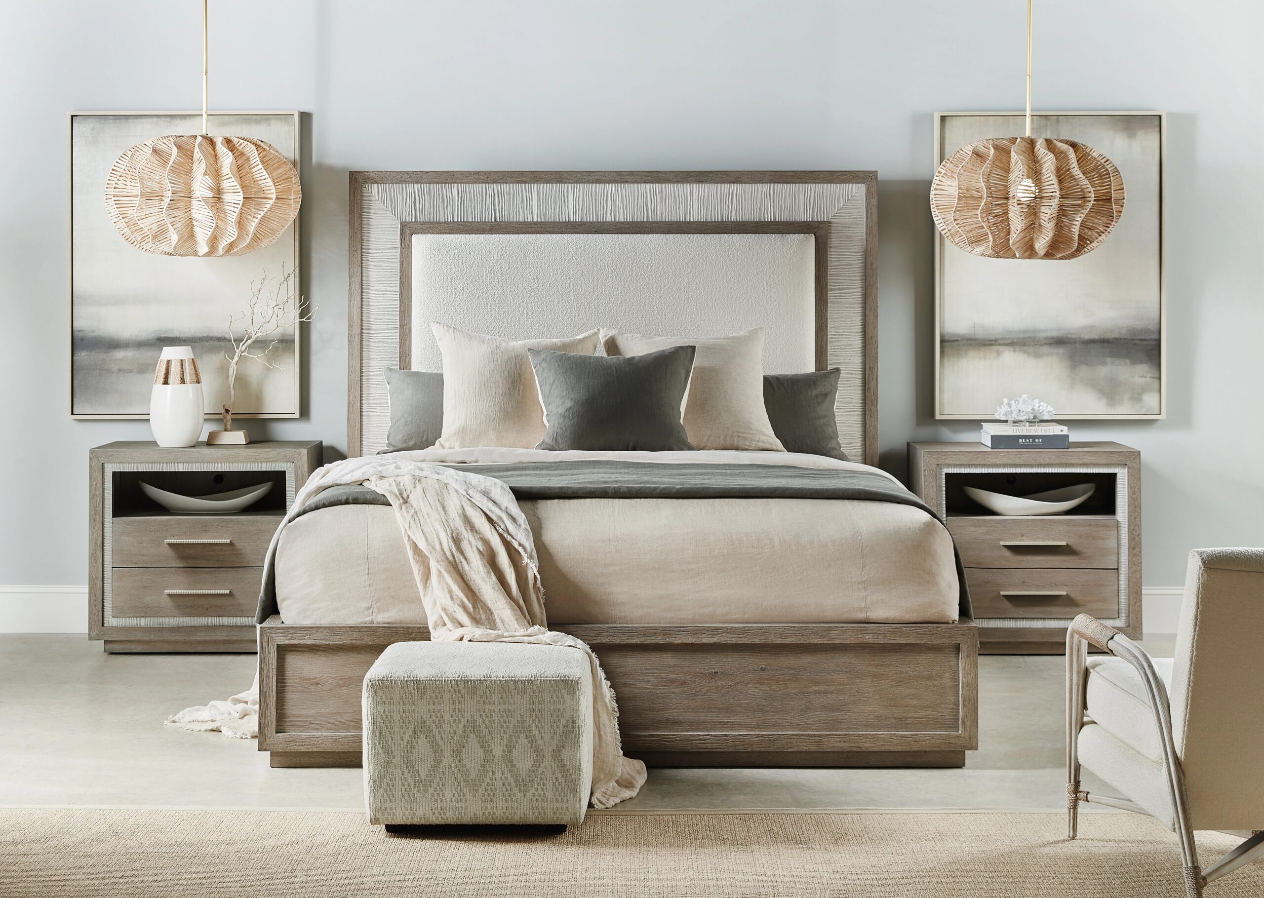 In a crisp two-tone finish combining a gray washed oak with a contrasting textured light gray color, the Serenity Rookery California King Upholstered Panel Bed brings the organic tones and textures of cottage waterfront living to your bedroom retreat. Crafted of Oak Veneers with the Macrame Artic fabric on the upholstered headboard, the bed includes the headboard, footboard and rails. The headboard can be used alone.