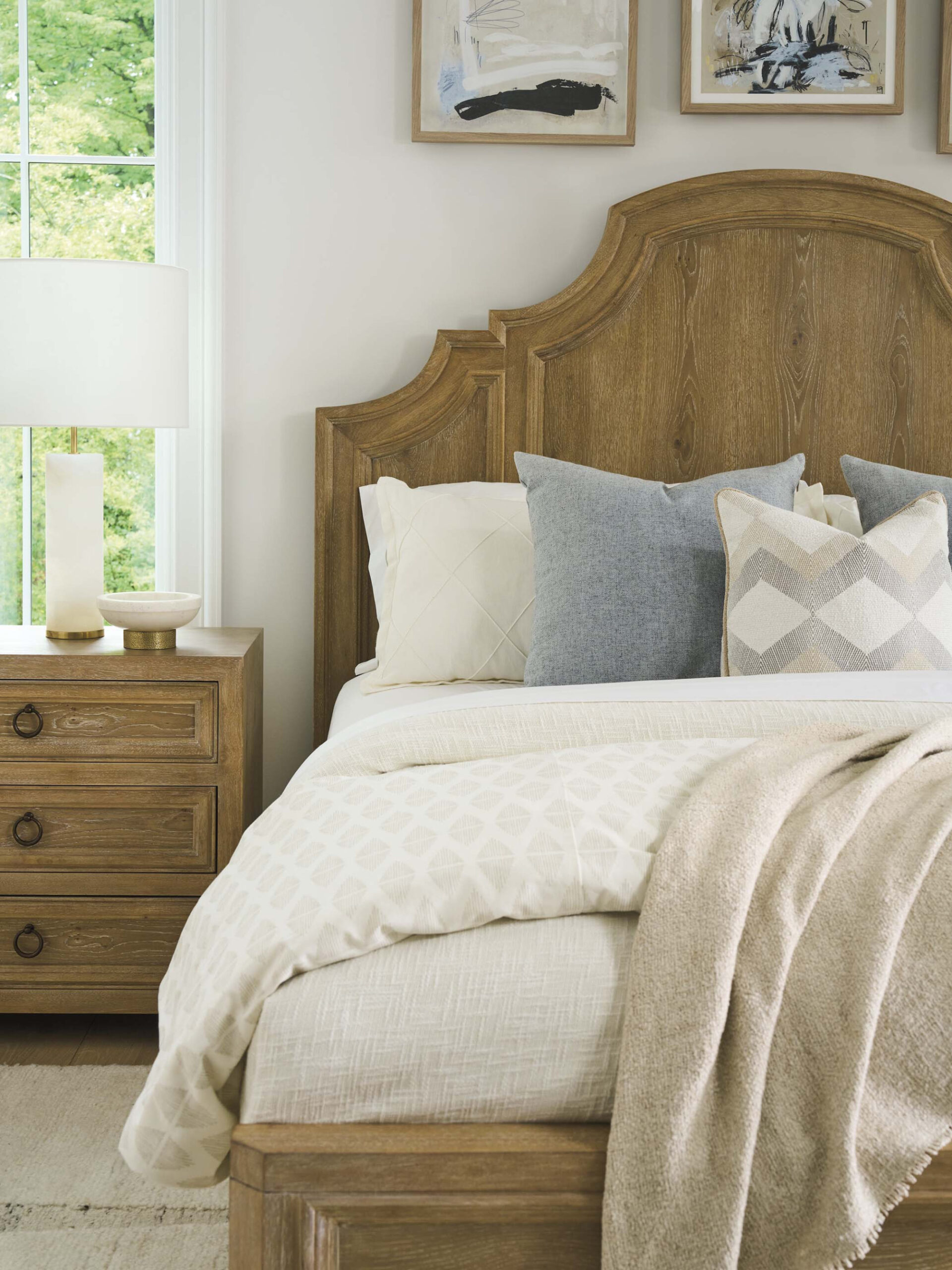 The Valley Club bed makes a striking visual statement, with its arched headboard showcasing a vertical pattern of white oak veneer, framed with raised panel molding. The footboard and side rails carry the same molding detail, framing a horizontal pattern of oak veneer. The design is also available as a headboard only.