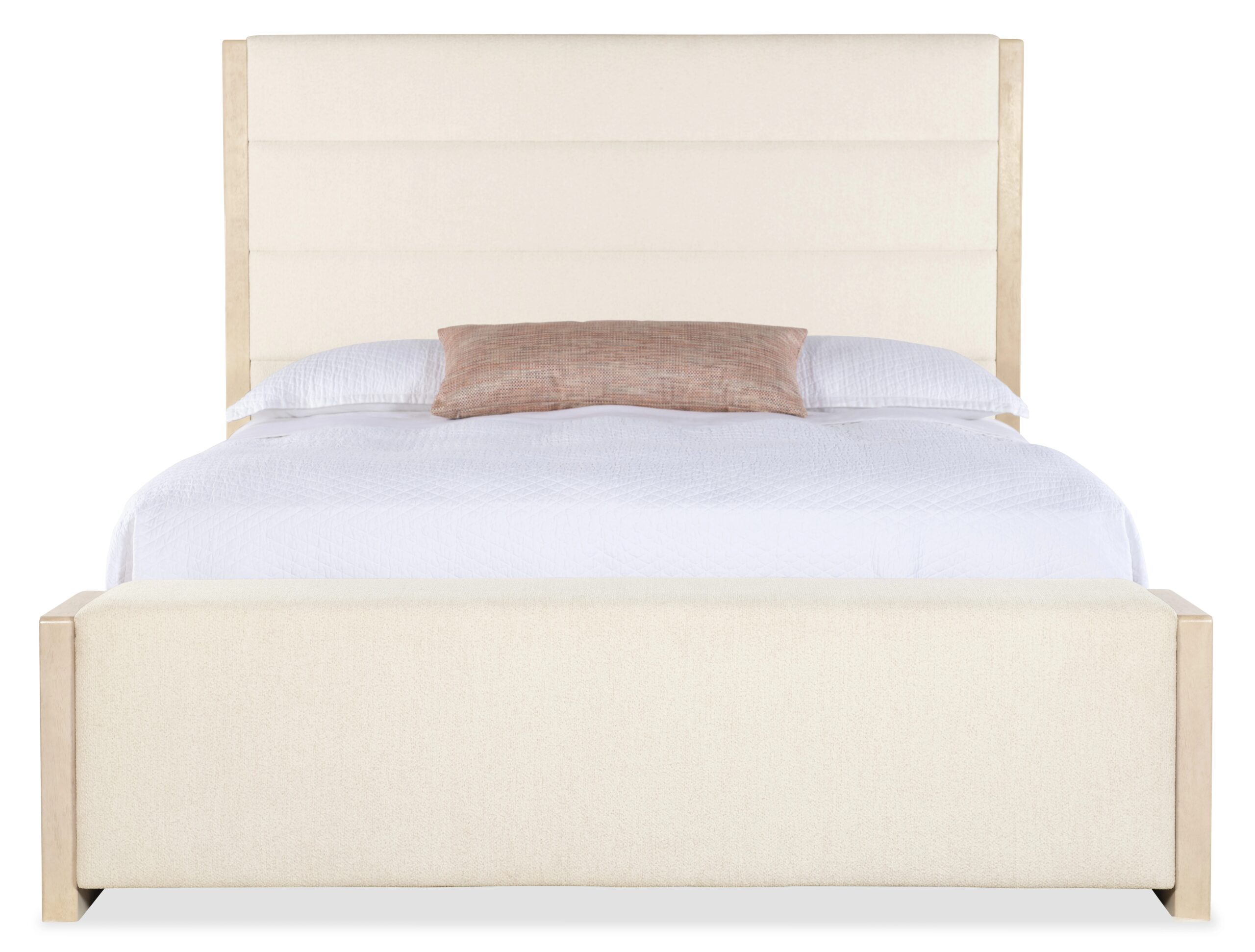 | Queen sizePerformance fabric upholsteryUpholstered bench footboard with hidden storage drawers on each sideFinish: Polished Limestone finish on quartered oak veneers | Yes |