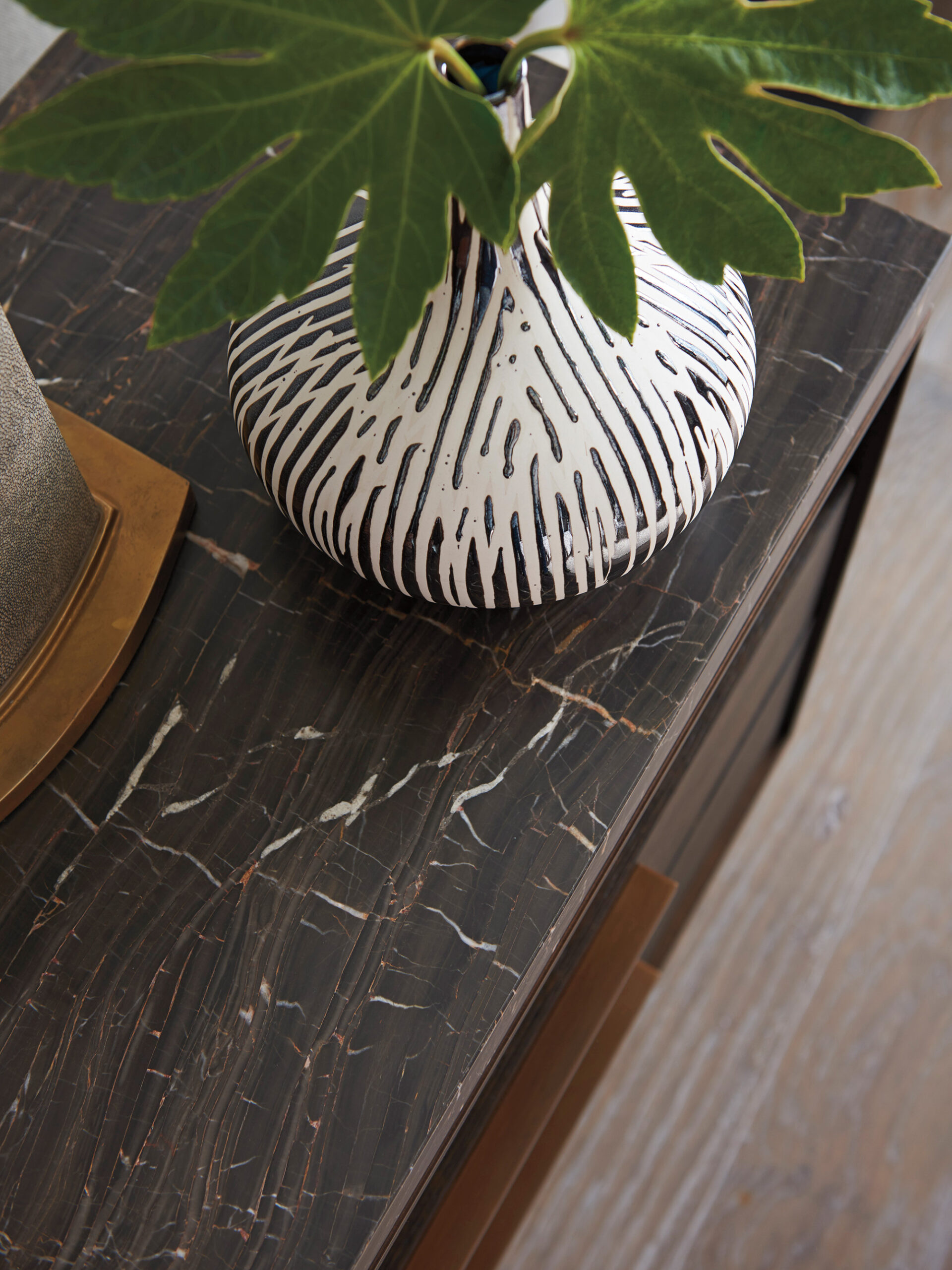 The exceptional design includes an Alpine marble top floating over a metal frame. Beneath the open compartment are two storage drawers with soft-closing drawer guides sitting on a plinth base. As with any natural marble, the veining pattern will be unique to each piece.