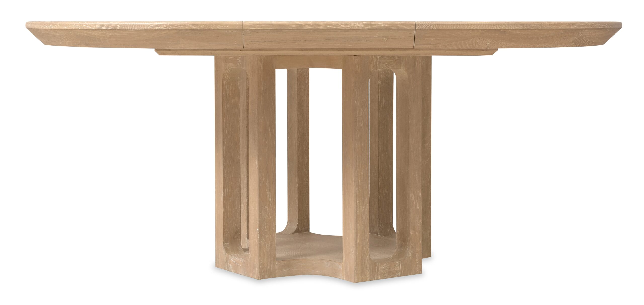 The Banyon Bay Round Dining Table combines modern lines with natural materials for a casual yet elegant look. This white oak table features one 18-inch leaf that extends the table to 72 inches long, making it perfect for both intimate and larger dining gatherings. The open pedestal base provides sturdy support, while the Desert Oak finish adds warmth with its wire-brushed and cerused details. The Banyon Bay collection’s youthful and eclectic design makes this table a standout piece in any home.