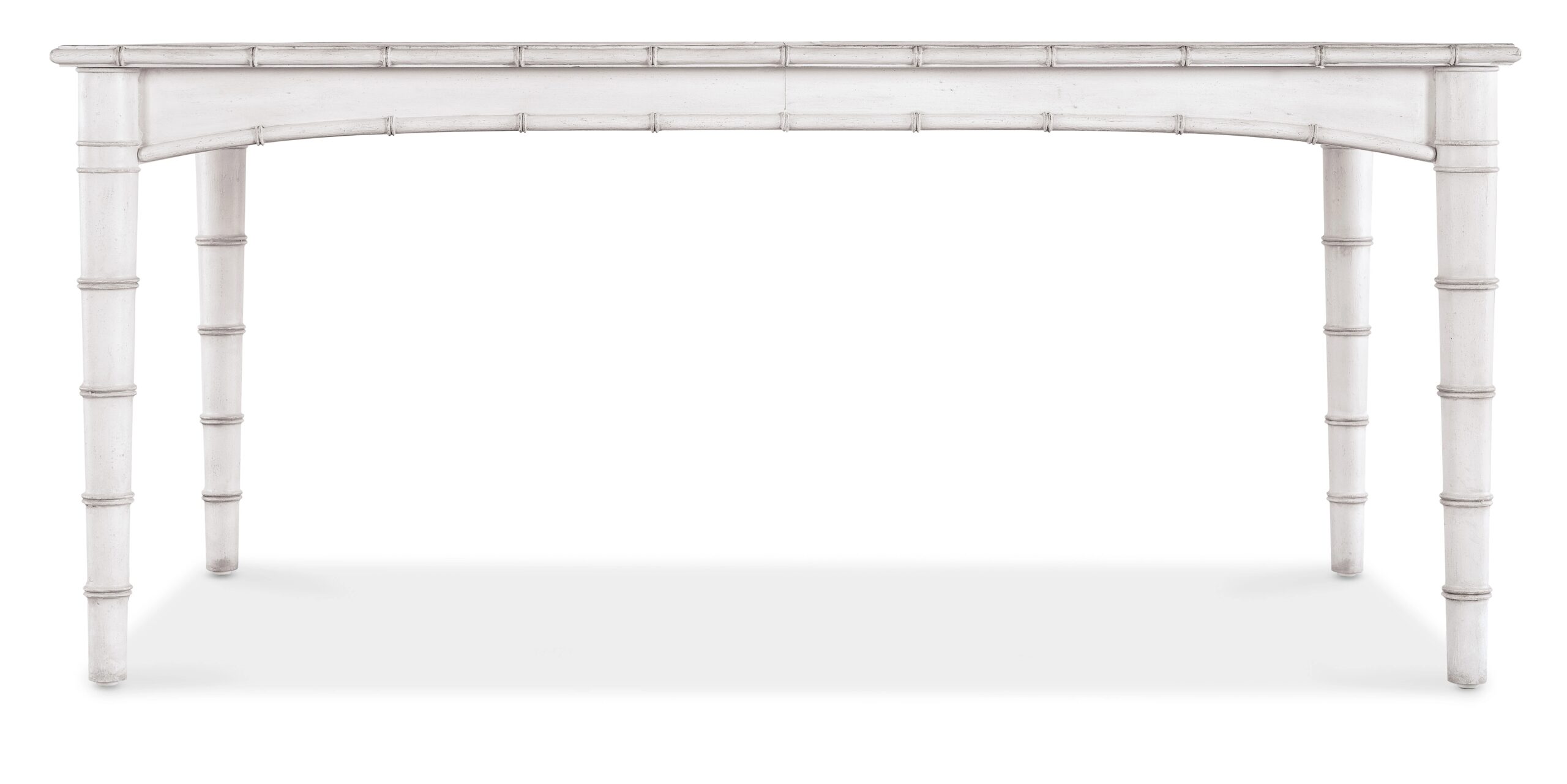 Rectangular dining table with bamboo-motif accents and slender bamboo-style legs, finished in White Heron with a solid-wood edge top. Includes a 20 in. leaf to extend to 88 in. for larger gatherings.