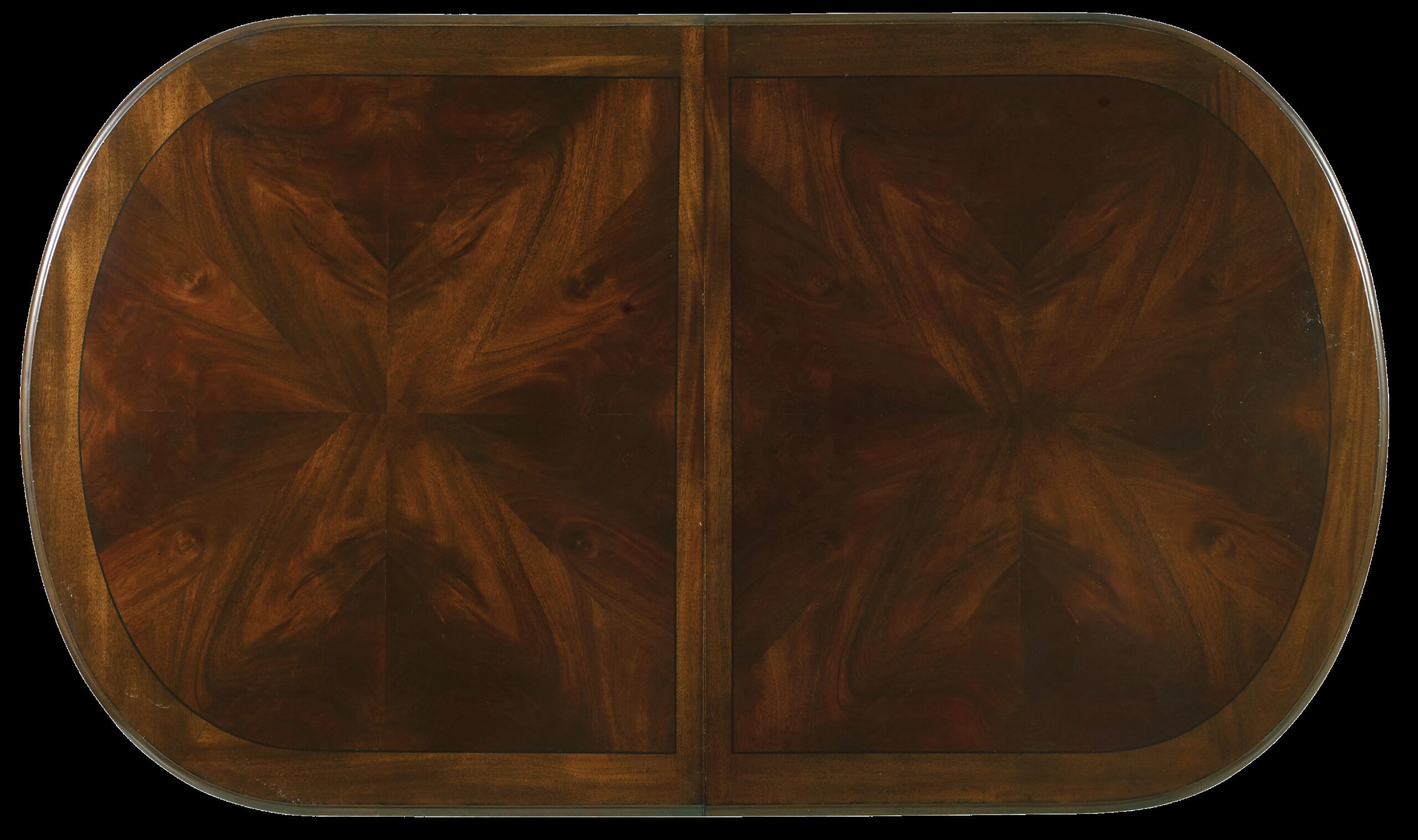 Oval dining table in a rich mahogany finish with decorative cathedral and swirl veneer top. Includes two 18 in. leaves to extend seating for up to eight.