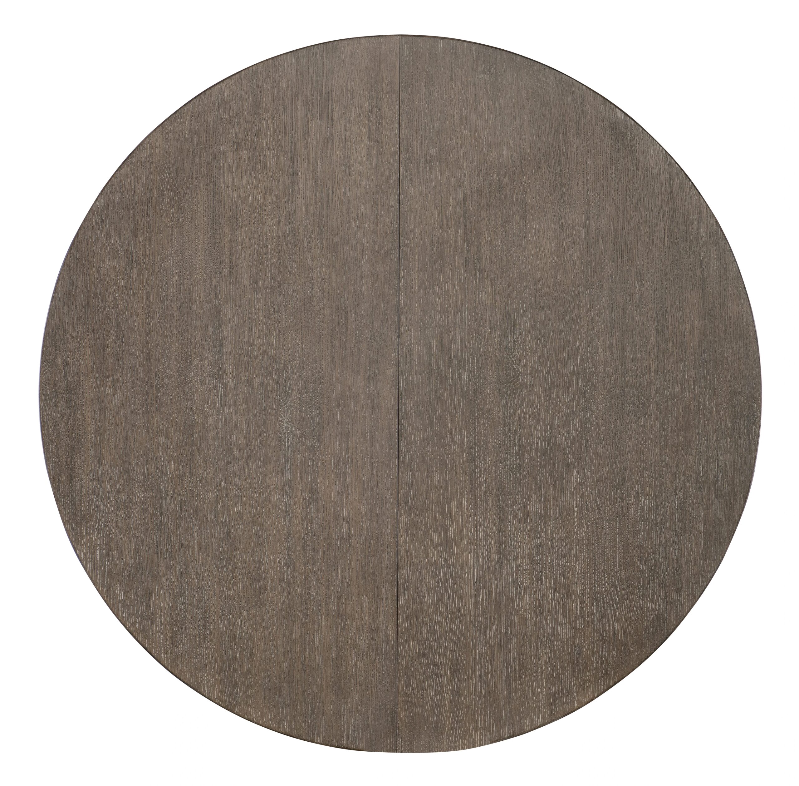 Inspired by decades of design movements with an unmistakably modern aesthetic that transcends time, the Modern Mood Round Dining Table is a statement piece with a softly sophisticated profile. Featuring metal banding accents on the base in a warm pewter finish, it is crafted of Quartered Oak Veneers with dark, earthy brown hues with notes of black. With one 18-inch leaf, the table extends up to 72 inches round.
