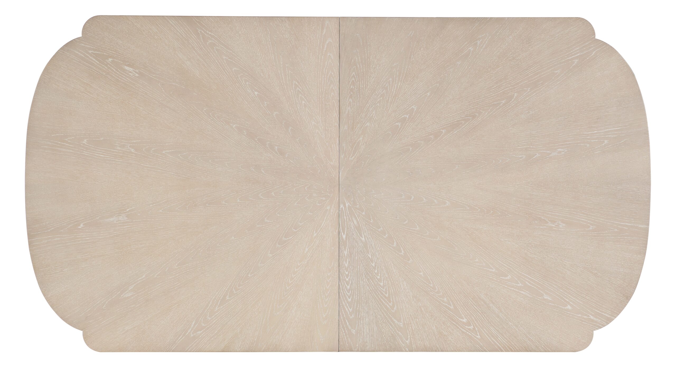 Bring serene style and calm chic to your gatherings with the Nouveau Chic Rectangle Dining Table. Crafted of Quartered and Cathedral Oak Veneers with light wire brushing to create the Sandstone finish, the table has curved, scalloped ends and metal ferrules on the legs, along with a metal accent at the top of the legs. With one 22-inch leaf, the table extends to 104 inches to accommodate 8 guests and six guests without the leaf.