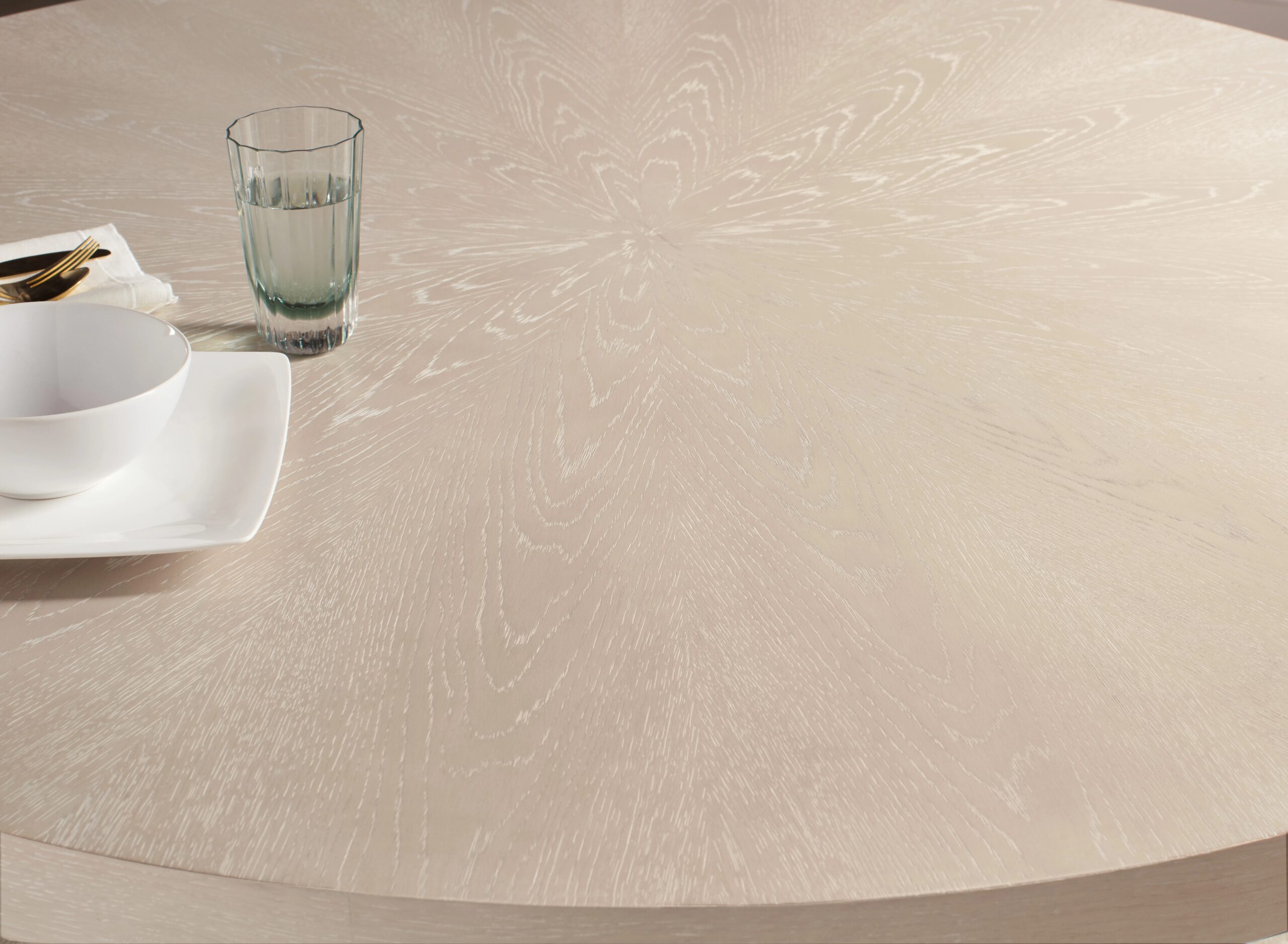 With an hourglass-shaped pedestal base tied in the middle with a metallic-finished collar, the Nouveau Chic Round Dining Table brings serene style to any space. Crafted of Oak Veneers and Resin with a sunburst veneer pattern on top, the table has a Sandstone finish. Accommodates up to 6 coordinating chairs.