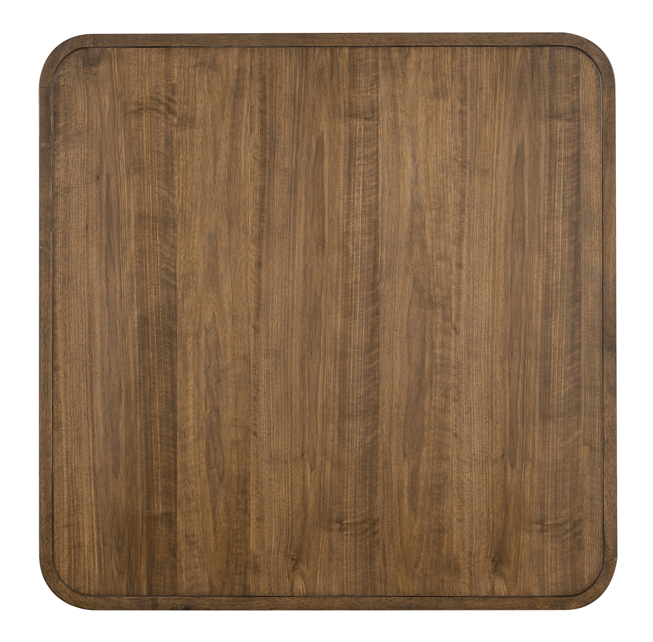 Square dining table with a figured walnut veneer top in a Light Caramel finish and plated Sunlit Bronze metal legs. Clean geometry and warm materials suit everyday dining and intimate entertaining.