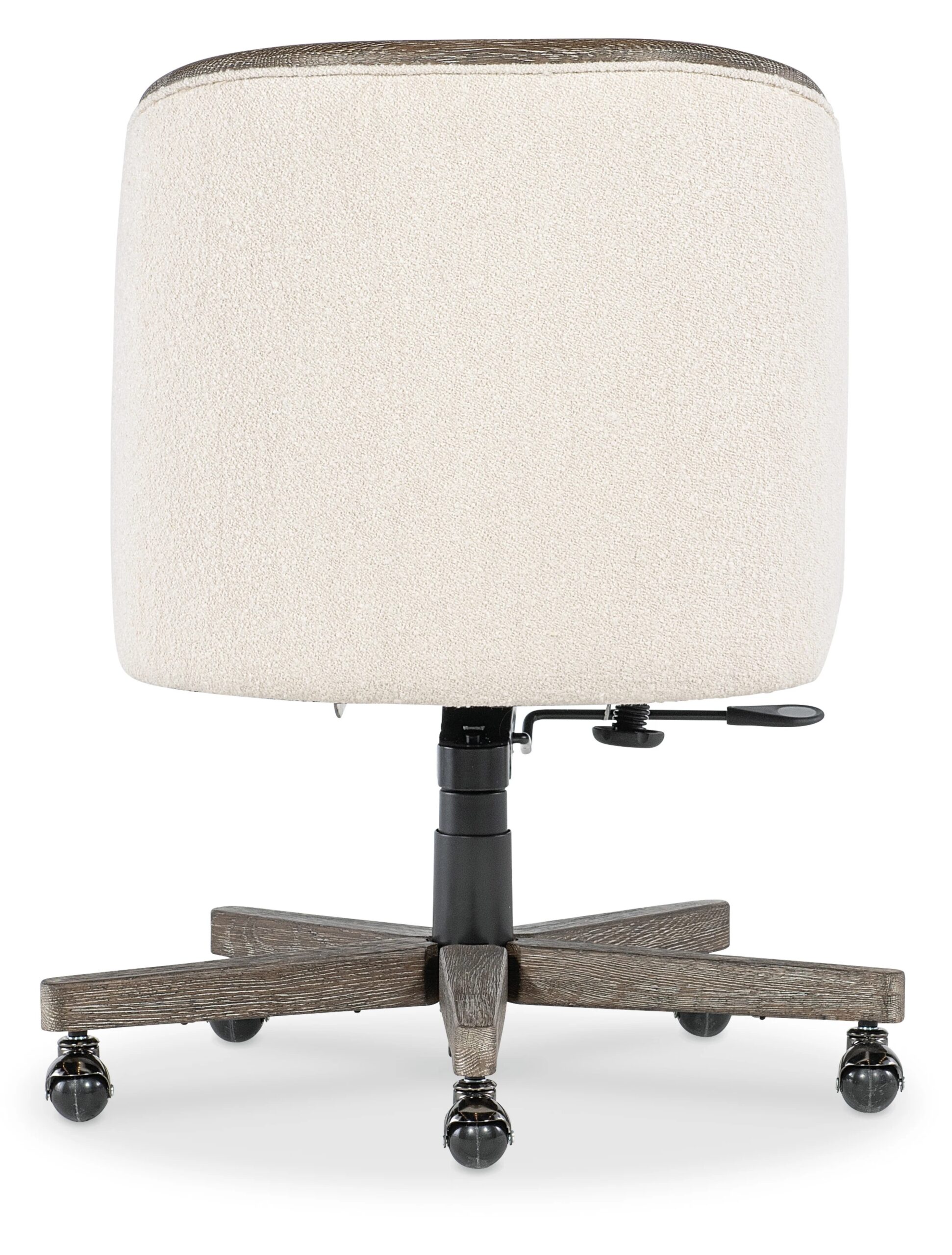 Discover the Paloma Executive Swivel Tilt Chair in the timeless Mink finish, designed by Hooker Upholstery for contemporary home office spaces. Featuring a barrel back design with wire-brush detailing in dark, earthy tones, this chair exudes a classic aesthetic. Upholstered in Inverness Natural fabric with easy-care properties, it offers adjustable height, swivel motion, and a sturdy dark wood trim and base. Ideal for professionals seeking comfort and style in their home workspace setup.