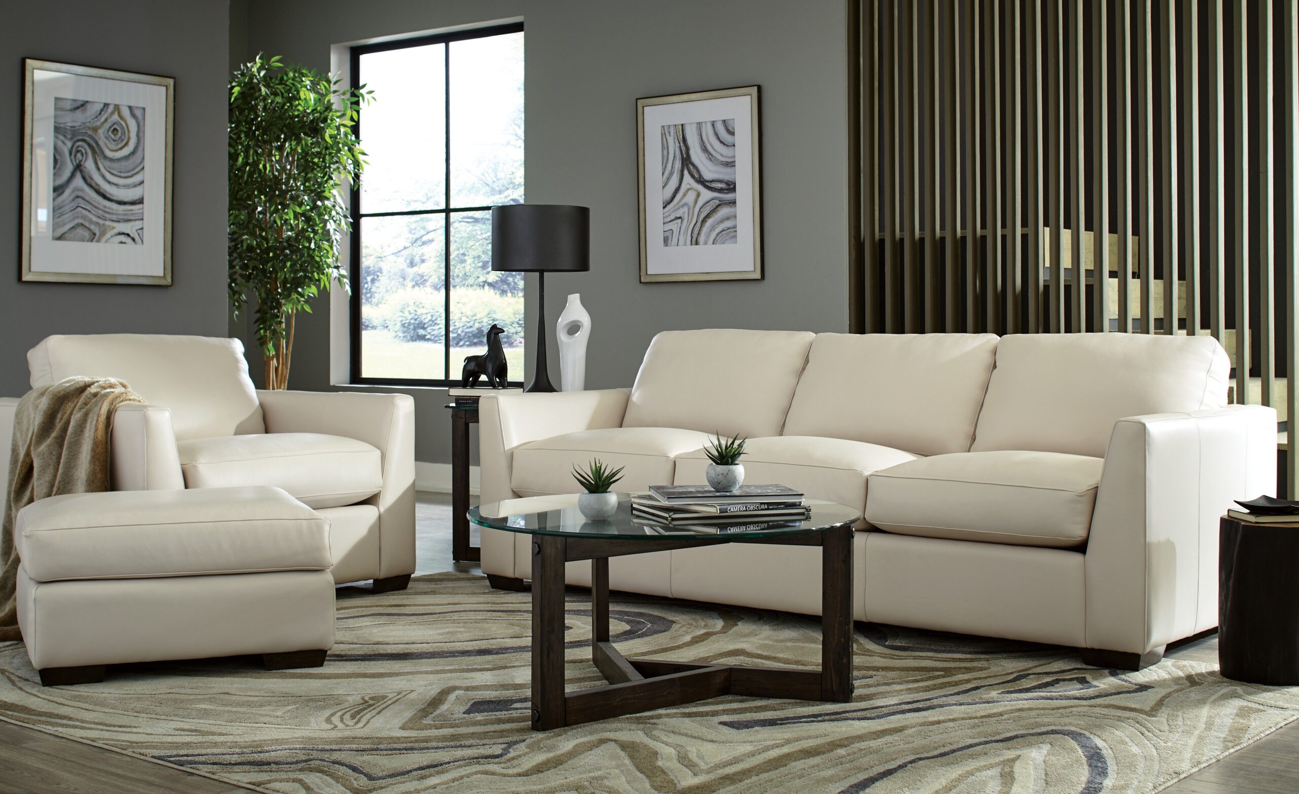 This modern leather sofa features architectural shaping and low, deep seating, designed to be both comfortable and on-trend. It’s generous scale and Blend Down Coil cushioning provide plush, seating for the whole family. French seaming, semi-attached box border back pillows, and low block legs. Also available are the matching loveseat, chair 1/2, and ottoman.