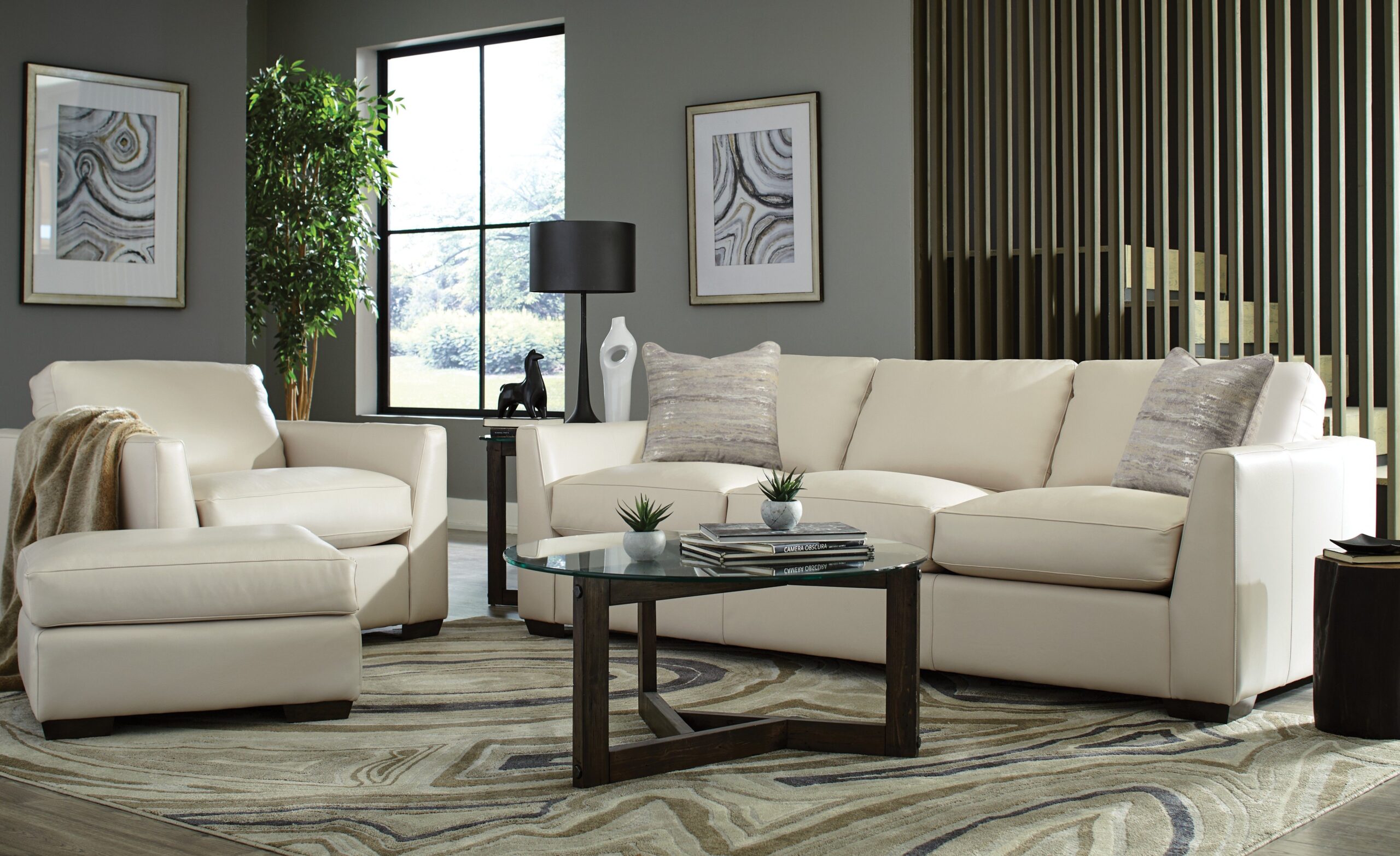 This modern leather sofa features architectural shaping and low, deep seating, designed to be both comfortable and on-trend. It’s generous scale and Blend Down Coil cushioning provide plush, seating for the whole family. French seaming, semi-attached box border back pillows, and low block legs. Also available are the matching loveseat, chair 1/2, and ottoman. This style is standard with one pair of Blend Down toss pillows in your choice of fabric.