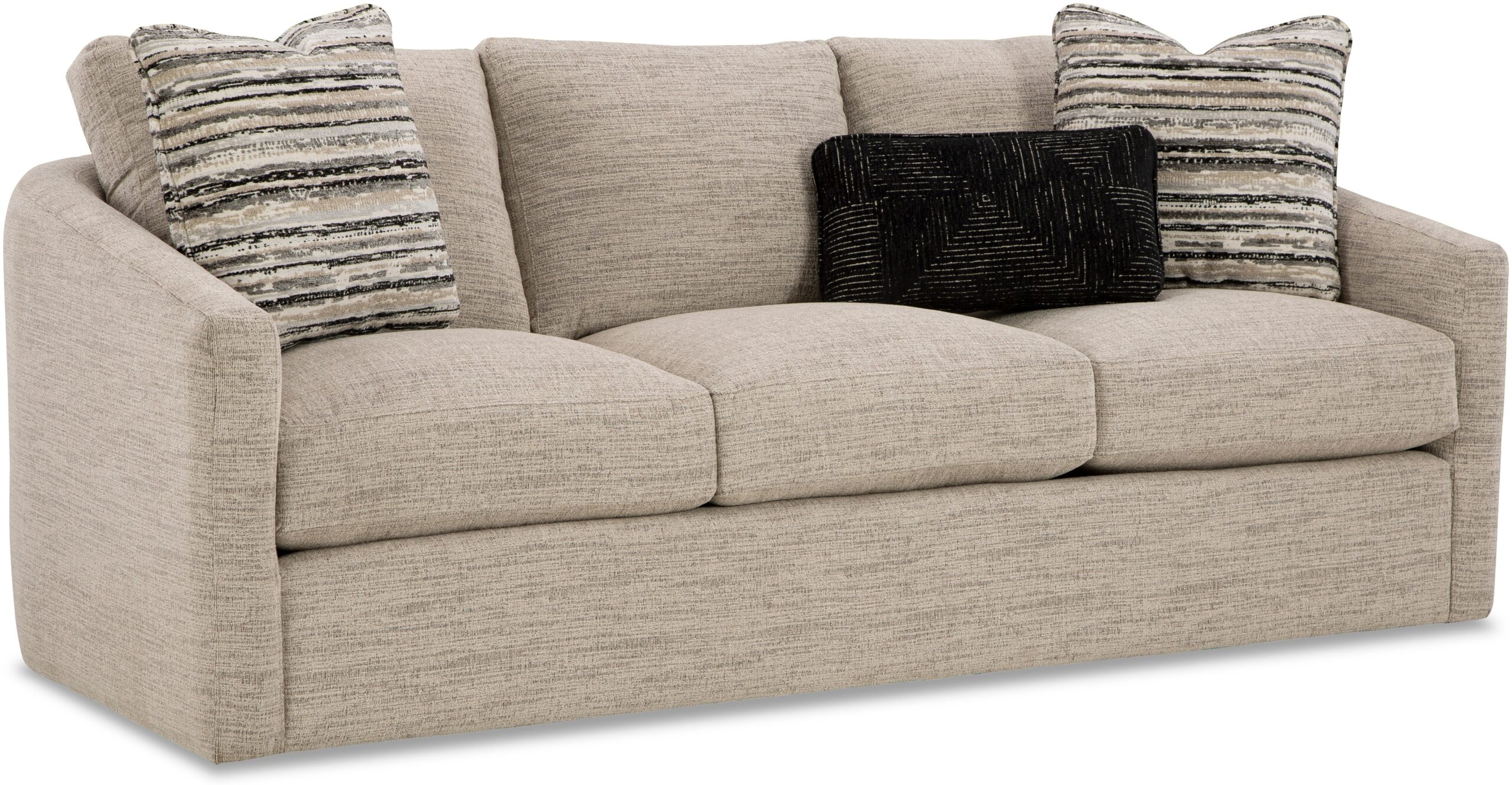 Make a statement with this chic and curvy style from our CM Modern collection. It features a high sloping track arm that wraps into a beautiful curve around the back, catching your eye from every angle. French seamed all over to give a clean and modern aesthetic, this piece has loose box border back pillows and plush Blend Down seat cushioning. Also available are the matching loveseat, chair, swivel chair, ottoman and sectional.