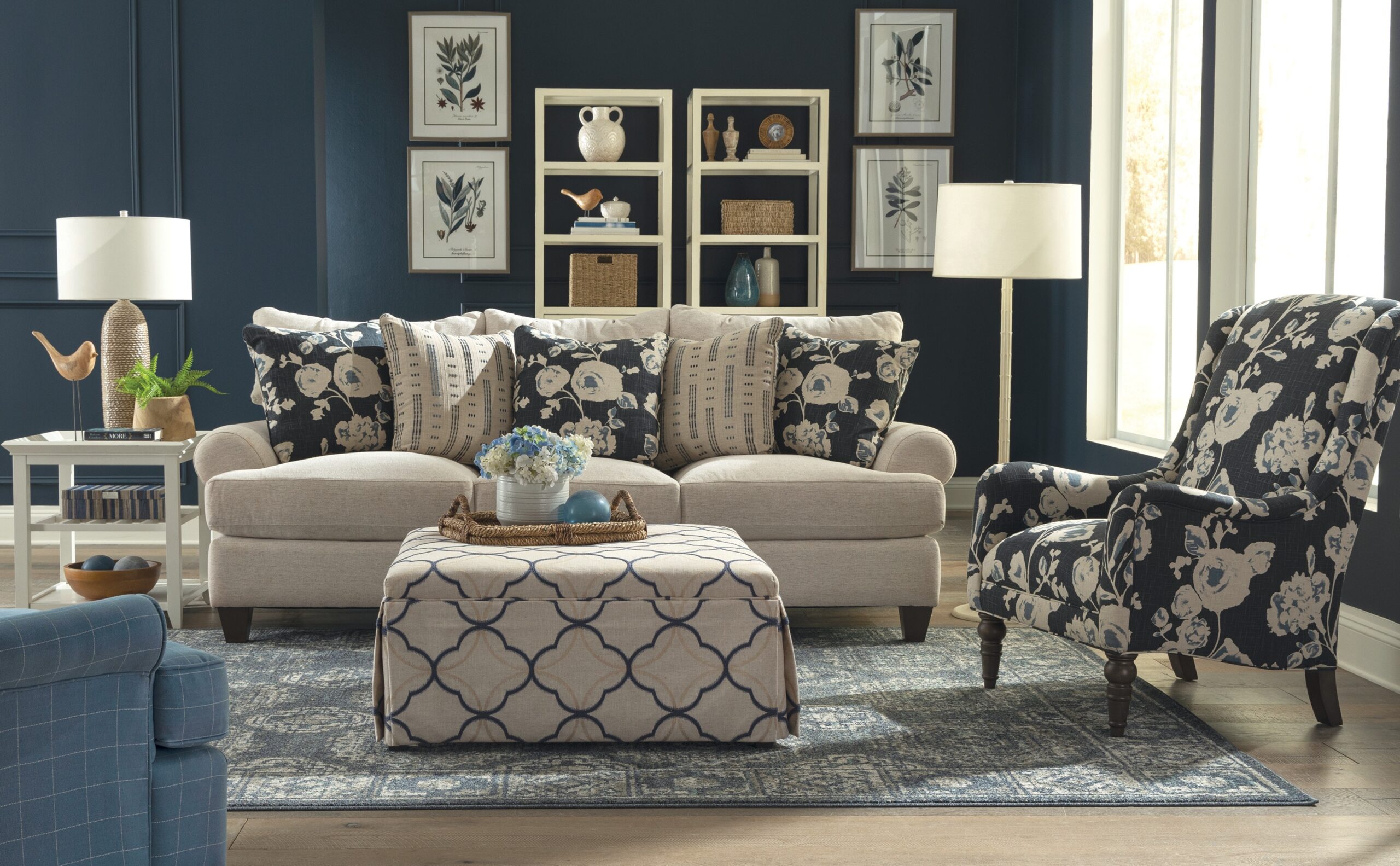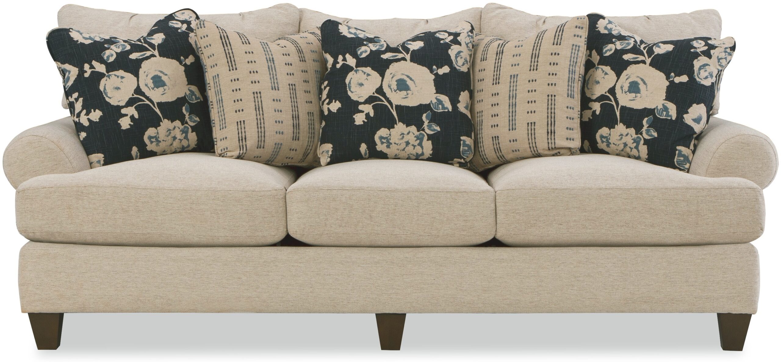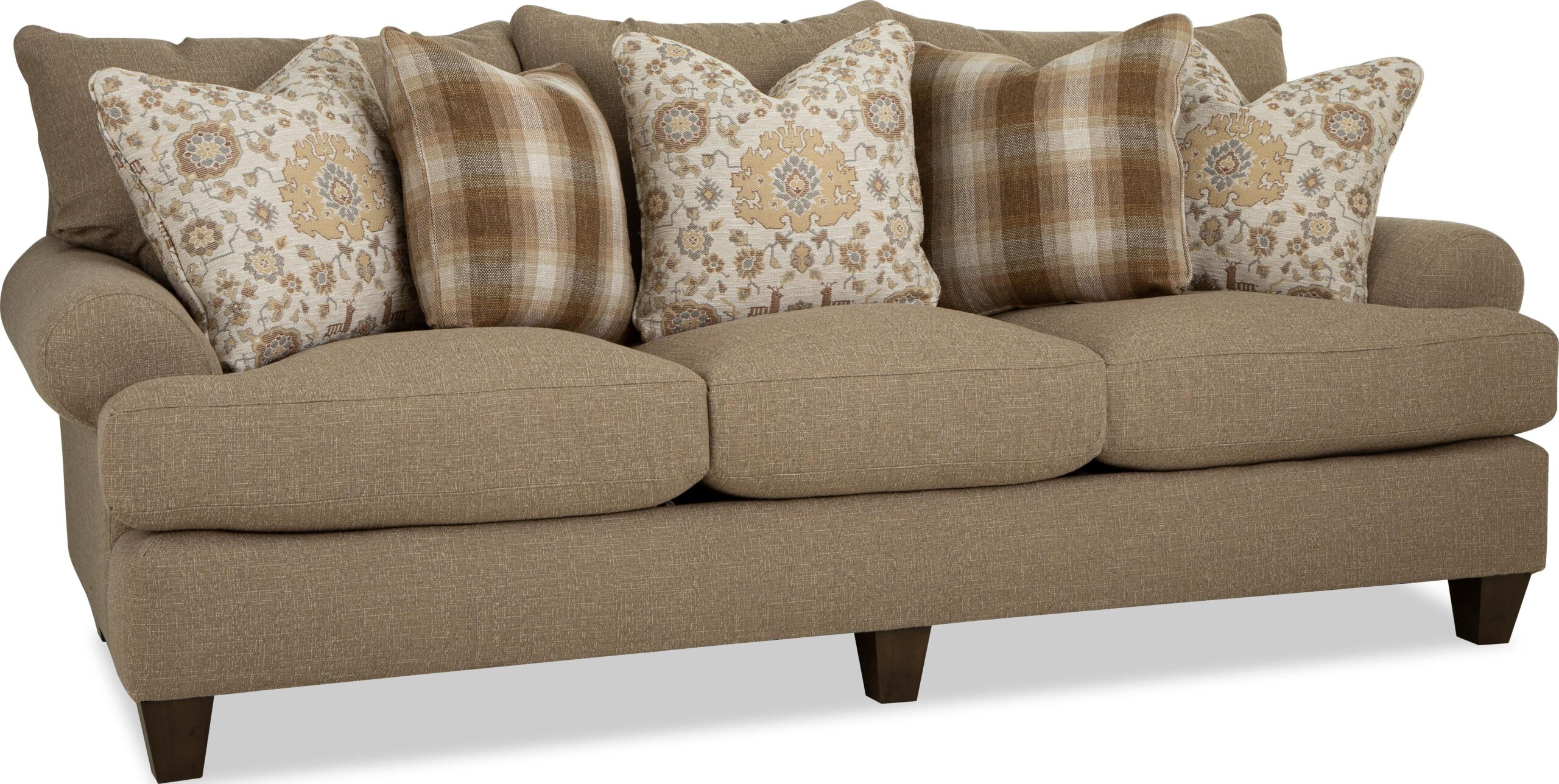 This casual sofa, from the Paula Deen Home collection is one of our favorites and it’s easy to see why! For starters, it’s a generous 100” long and features an armload of pillows to curl up and relax on. The loose pillow backs, sock arms, and tapered wood legs give it the laid-back, casual look that Paula is so proud of! It also features her exclusive Down Blend cushions that wrap you in comfort from the first moment, but will last for years. This style is also available as a 2 -piece sectional in varying sizes. Also available are the matching loveseat, chair 1/2, ottoman.