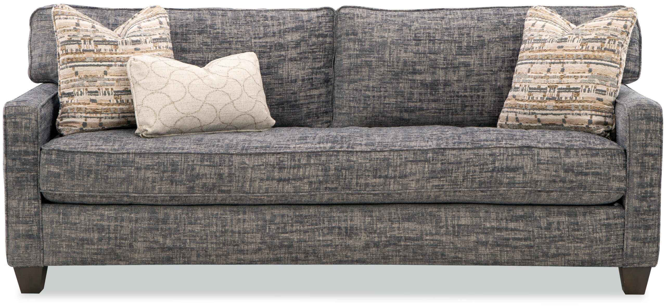 This piece seamlessly blends a minimalist look with the plushest seating we offer to give you the best of both worlds. Featuring welted track arms, simple tapered legs and loose box border backs, this sofa incorporates our Super Soft Blend Down seat cushion and backs as well as Luxdown toss pillows for billowy soft feel. Also available with 3 seats or 2 seats in 80″ and 86″ lengths. Also available are the matching loveseat, chair, ottoman and 77″ 2-seat queen sleeper. Also available with a removable slipcover as style 9374.