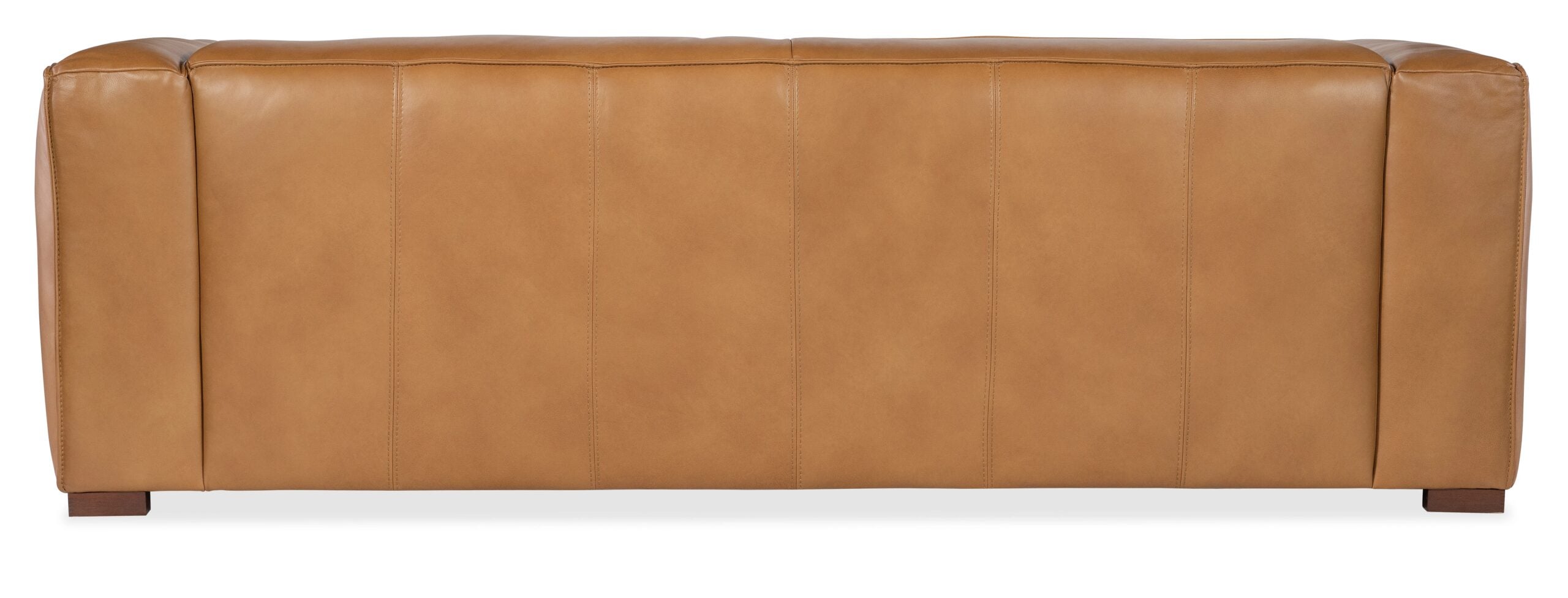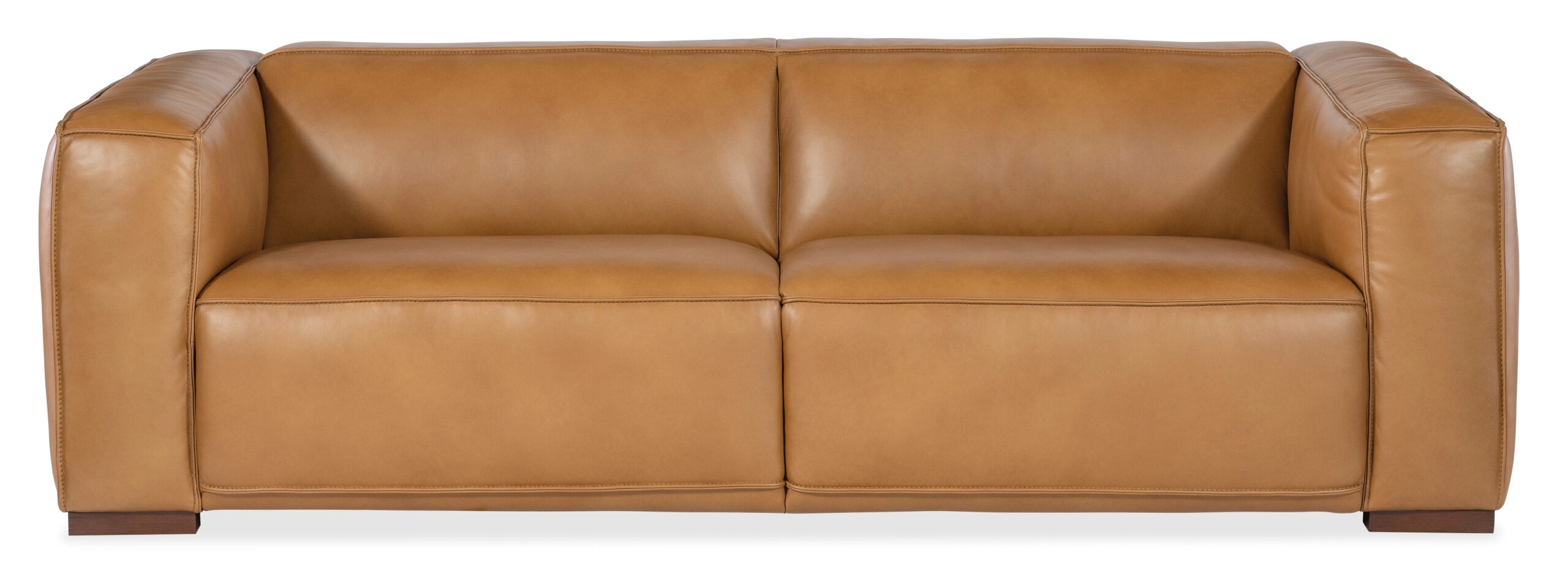 A sleek, low-profile silhouette with wide track arms, wood block feet and flange welt trim are paired with a warm and inviting caramel-colored luxurious semi-aniline leather cover in the 95-inch wide Maria two-seat Sofa.